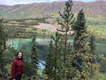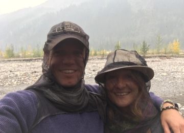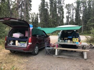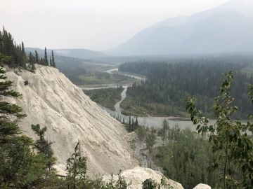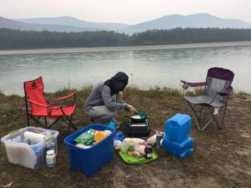 Na přenocování jsem vybrala nádherné místo s výhledem nad řekou Liard. Jediné, co nás ráno trochu otravovalo byly mušky, které s oblibou létají kolem hlavy a do očí, nosu i pusy. Ale obličejové síťky nás zachránily 😊