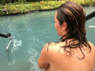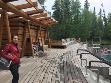 Dál jsme pak pokračovali k Liard River Hot Springs, které (jak už název napovídá), jsou známé a oblíbené hlavně kvůli horkým pramenům. Ty najdete ve stejnojmenném provinčním parku a vede k nim opět krátká procházka po dřevěném chodníčku. Místo je velmi oblíbené i v zimě, kdy je vše zapadáno sněhem. My jsme původně plánovali asi 2hodinovou zastávku, nakonec jsme tam strávili hodiny 4 a bylo to skvělé, jen doporučuji si vzít dostatek vody a jídla, jelikož jsou zde jen převlékárny a k autu to je daleko. To jsme nechali na parkovišti společně s poplatkem $5/osobu, který se v sezoně platí.