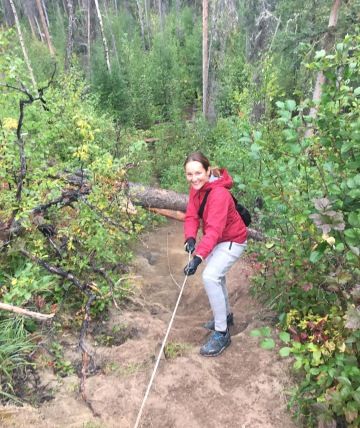 Cesta nás zavedla přes Mucho Lake s malou zastávkou a procházkou u Mineral Licks Trail, což je krátká procházka cca 1,5 km na protažení z auta a poměrně zajímavé místo. Jedná se o obnažené pískovcové skály nad řekou Trout River, které obsahují základní minerály důležité pro divokou zvěř jako je karibu, los atd. Což z tohoto místa dělá skvělý pozorovací bod, hlavně ráno a večer.