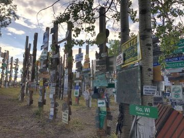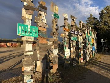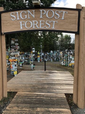 Asi každý, kdo tudy projíždí udělá zastávku v městečku Watson Lake, které je známé svým Sign Post Forest neboli Les značek. Tato populární tradice vznikla velmi nevinně, když jeden voják, kterému se stýskalo po domově zde roku 1942 umístil ceduli se svým rodným městem a dopsal k ní vzdálenost, která ho od něj dělila Danville, Illinois 2835 miles. Později se přidalo několik dalších lidí, a další značky se nabalovaly. Nyní je v lese odhadem přes 80 000 značek, cedulí, SPZ a všech možných nápisů. I my samozřejmě hledali ty domácí, české, a nebylo to nic těžkého, protože my jsme všude 😊