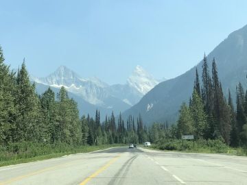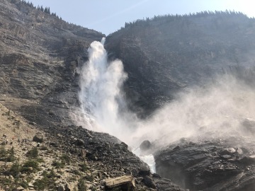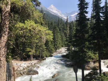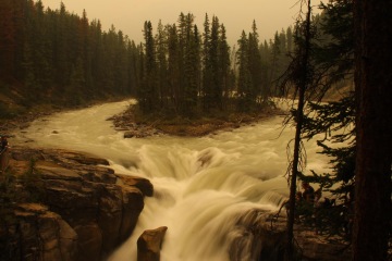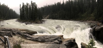 Doporučuji projet si silnici Icefields Parkway, která spojuje Lake Luise s Jasperem, a po cestě je spousta nádherných zastávek, výhledů a možných procházek. Jedním z největších a nejdostupnějších ledovců je Columbia Icefield neboli Athabasca glacier. Silnice vede velmi blízko, je zde veliké informační centrum, kde si můžete zaplatit tour v ledu se zkušeným horským vůdcem nebo se projít po proskleném chodníku Columbia Icefield Skywalk. Naše realita byla opět smogová, proto jsme nafotili, jak by to mělo vypadat a nějaké bližší prozkoumávání jsme vzdali a pokračovali dál. Krátká zastávku u vodopádů Athabasca Fall byla příjemným zpestřením této kouřové situace a velmi vítanou procházkou kolem divoké soutěsky, kudy se za mohutného dunění valí valí voda.