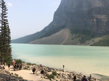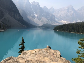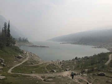 Dalším krásným jezerem je Peyto Lake, které má připomínat svým tvarem vlka. Opět vás okouzlí nádherná jasná tyrkysová barva vody, jež je tak specifická pro ledovcová jezera. Nejvíce vynikne za slunného dne. Bohužel my jsme stále měli velký opar z letních požárů a sice jsme siluetu jezera viděli, ale nebylo to nic ohromujícího. K vyhlídce na jezero musíte překonat něco málo přes 100 výškových metrů, ale za odměnu se vám otevře krásné údolí. I zde bývá dost lidí, takže jsou alternativy dalších vyhlídek s náročnějším výstupem.