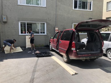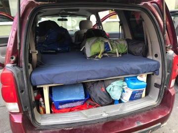 Naštěstí jsme měli přátele s vrtačkou a různým pracovním vybavením, a i zkušenostmi se stavbou postele. I s nákupem materiálu a stavbou nám to zabralo jedno odpoledne. Koupili jsme dřevotřískovou desku, několik prken jako podpěry a bylo hotovo. Dál jsme si sehnali molitanovou matraci, několik beden, které se daly zašoupnout pod postel – doporučuji si změřit jejich výšku – a pak už jen vybavení jako vařič, plastové nádobí, pánev, hrnec…to vše se dá levně sehnat např. v Armádě spásy a podobně. Možná se to zdá jako rozmar, ale vezli jsme si normální peřiny a polštář, bylo to příjemnější než spacák. Ten jsme samozřejmě také měli a využili, když bylo venku třeba -10 nebo šli na několikadenní hike.